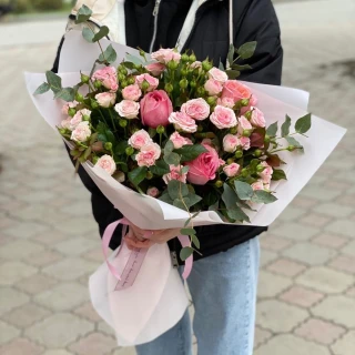 Расцветите вместе с букетом " Прикосновение нежности " - нежным и изысканным наполненным чувствами цветочным ансамблем. Этот уникальный букет составлен из восхитительно красивых одноголовых и кустовых роз розовых оттенков, которые нежно объединяются в единую гармонию. Их нежные лепестки, играющие разными оттенками розового, дарят ощущение тепла, любви и радости. Упаковка букета, выполненная с особым вниманием к деталям, подчеркивает его изысканность и придает ему завершенный вид. Будьте в центре внимания и подарите этот букет " Прикосновение нежности " тому, кого цените и любите.