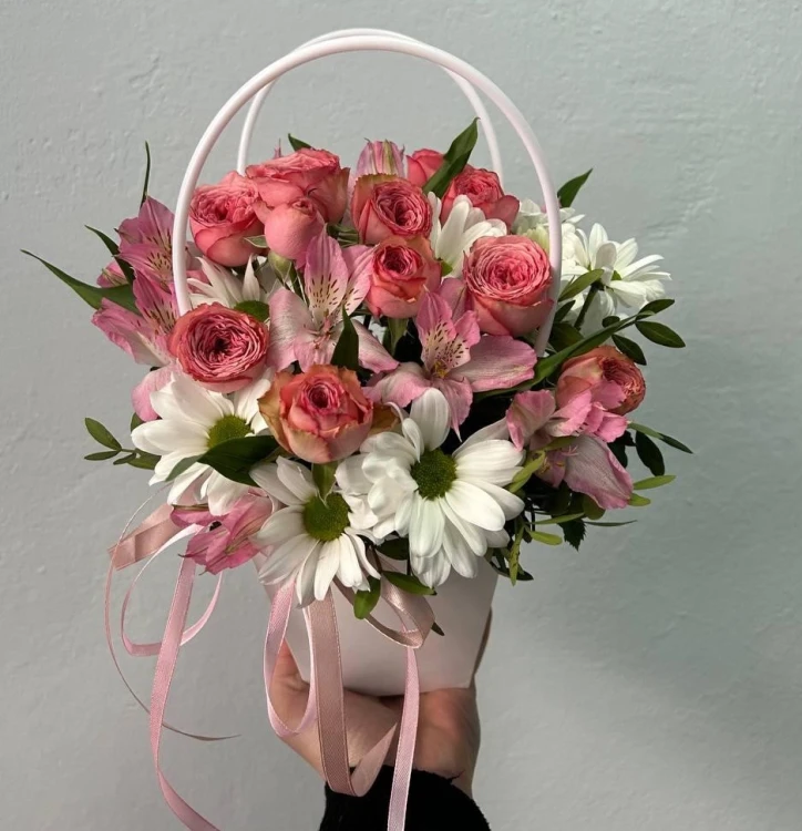 Эта великолепная композиция цветов воплощает в себе нежность и изящество природы. Кустовые розы, ромашковая хризантема и альстромерии создают вместе удивительное сочетание цветов и форм, напоминая о летнем саде в полном расцвете. Каждый цветок, будто живописная картина, раскрывает свою красоту и привлекает внимание своим уникальным очарованием. Яркие альстромерии добавляют ярких красок и радости, ромашковая хризантема приносит нотки домашнего уюта, а кустовые розы символизируют любовь и нежность. Все эти цветы тщательно собраны в элегантной легкой корзинке, подчеркивающей их изысканность и красоту.